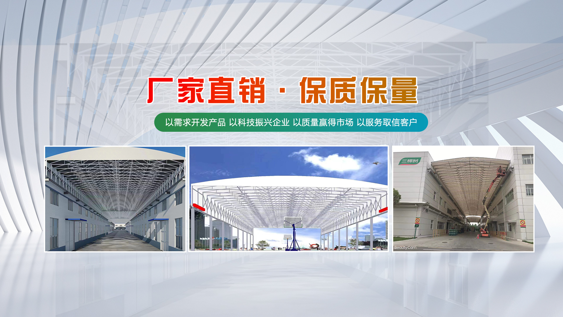江蘇鵬達膜結構工程有限公司從事鋼膜結構設計、制作、安裝、生產、銷售。本公司擁有現代化標準加工車間為其它鋼結構公司、膜結構公司、膜結構安裝隊提供大梁、異形鋼梁加工 ,提供膜材加工、批發 ,擁有各種進口、國產膜材供客戶選擇。經營項目涉及張拉膜、骨架膜結構、景觀膜結構、高速公路膜結構收費站、體育場看臺膜結構、膜結構停車棚、遮陽膜結構設施、充電樁、鋼結構廠房,玻璃雨棚、伸縮推拉篷等方面。公司全體員工本著堅持技術進步的方針,對所有作業程序都進行嚴格控制,確保為客戶提供良好的工程質量和售后服務。并將以齊全的技術設備、良好的產品質量、完善的施工隊伍、嚴謹的工作作風,極高的工作效率的為廣大客戶提供良好的精品工程。